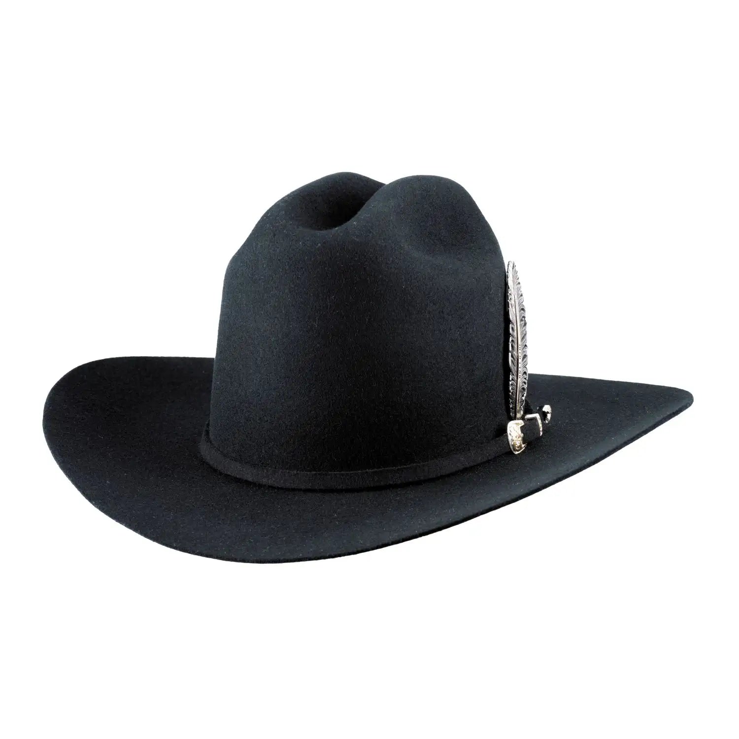 Featuring a Cattleman Crown and a 3 1/2" brim, this hat delivers the perfect balance of tradition and sophistication. The black-colored hat body gives it a bold and commanding presence, while the black hatband, adorned with a buckle and feather detail, adds just the right amount of contrast and character. The silver-toned buckle and delicate feather pop beautifully against the dark backdrop, making this hat a striking addition to any outfit.