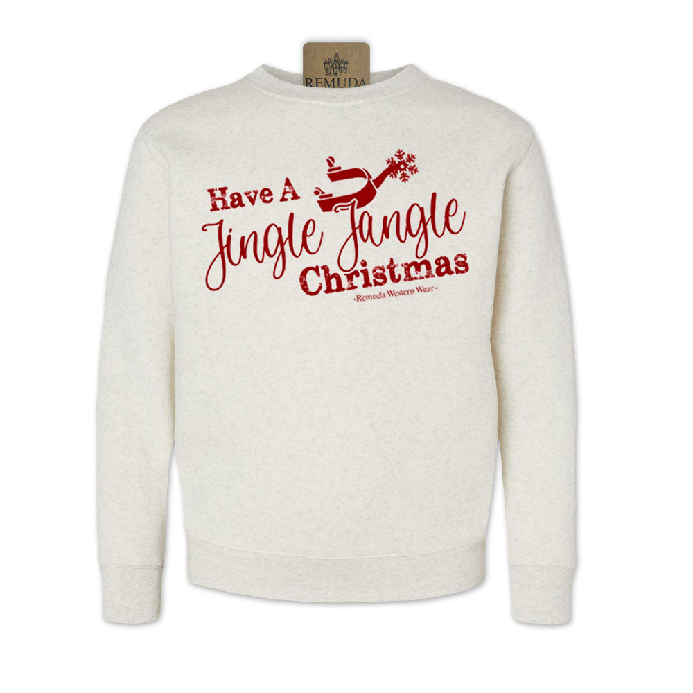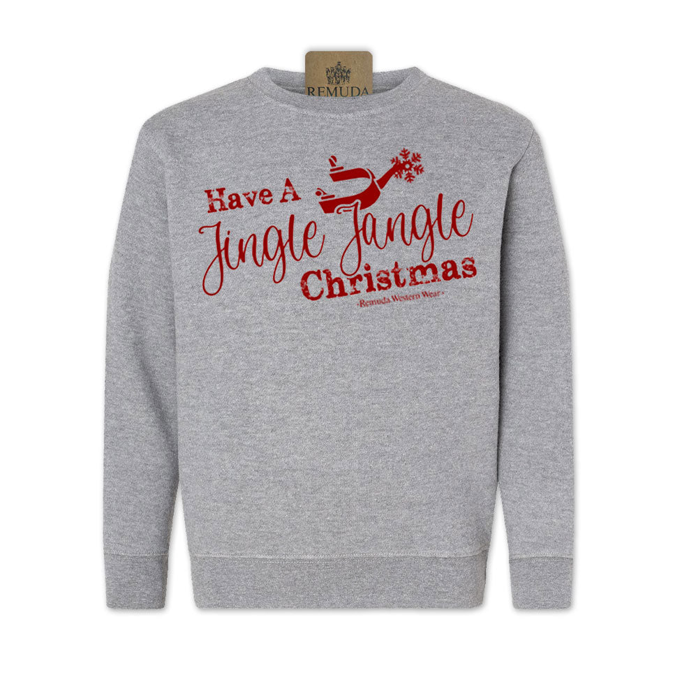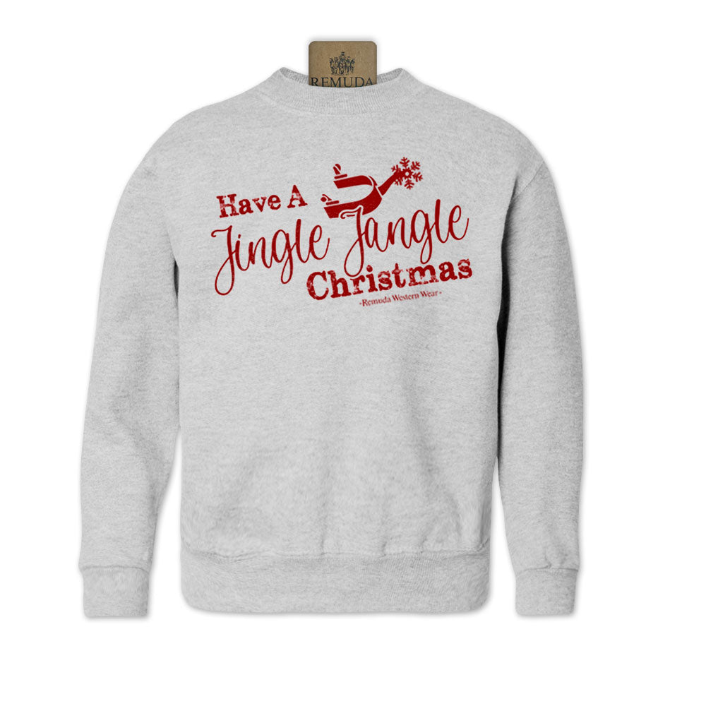 Dress your cowpokes in festive Western style with our "Have A Jingle Jangle Christmas" youth sweatshirt! This cozy sweatshirt features a playful spur design with a snowflake rowel and perfect for younger ranch hands ready to jingle and jangle through the season, this sweatshirt is ideal for holiday photos, family gatherings, ranch work. Get ready to rope in some smiles this Christmas with this adorable Western-inspired look!