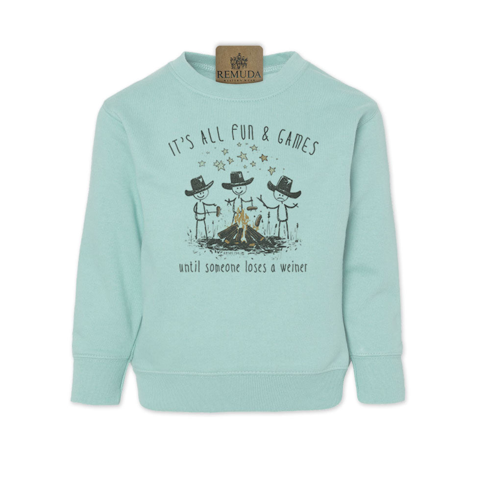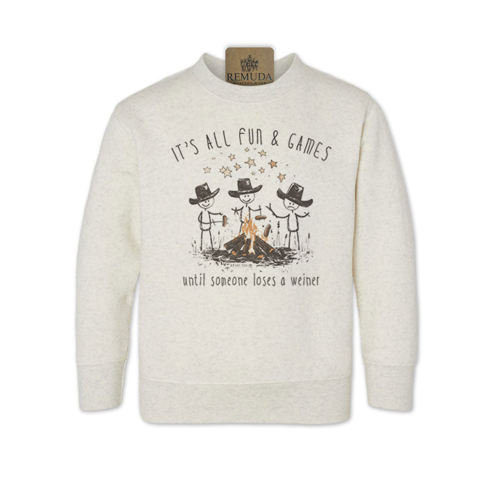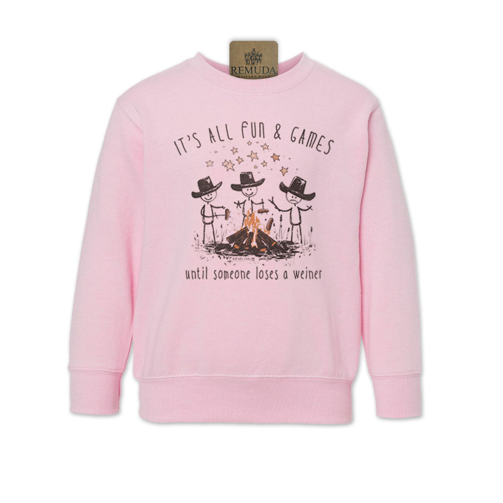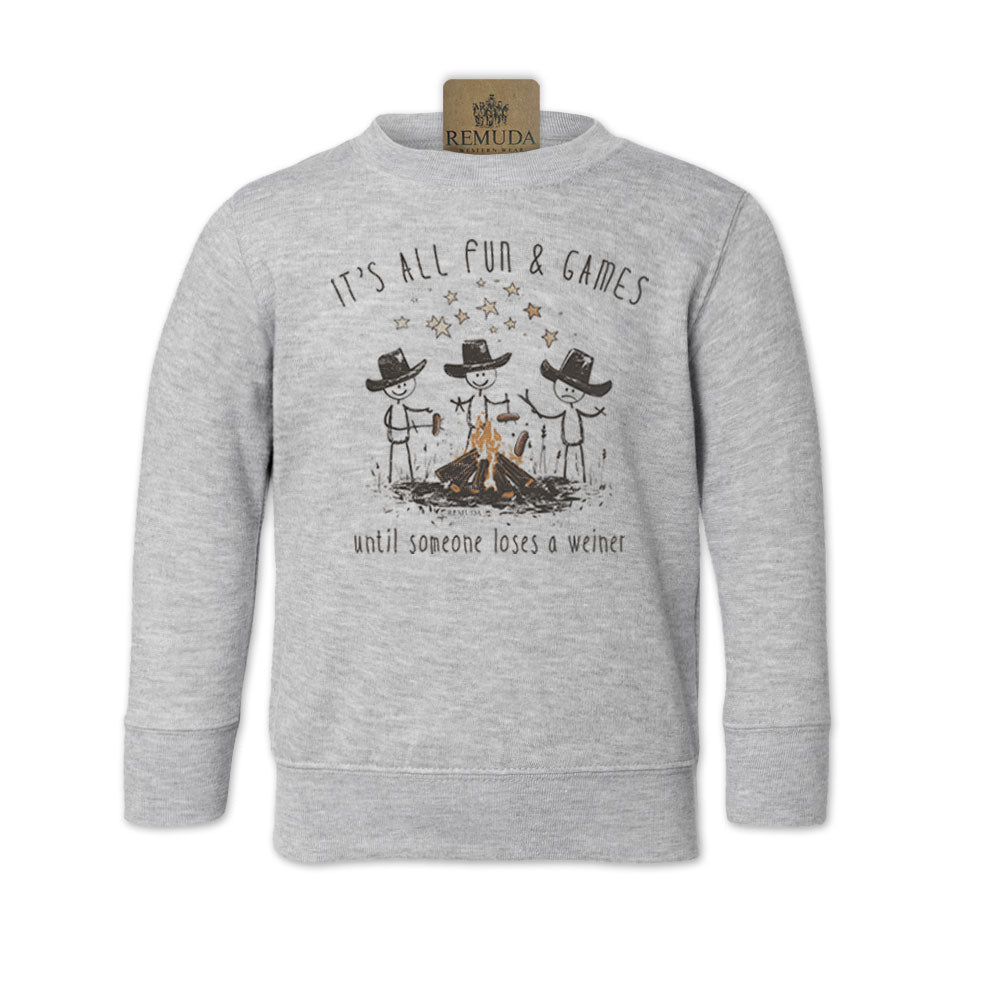 Ready to raise a future camping legend? This "It's All Fun & Games Until Someone Loses A Weiner" toddler sweatshirt is for the small bonfire buddies who know that roasting weiners is a serious sport—until someone loses one in the fire! Perfect for nights under the stars, this soft and snuggly sweatshirt keeps your little adventurer comfy as they learn the high stakes of s'mores and hot dogs. Whether they're mastering the art of the marshmallow or just stealing the show around the campfire, this sweatshirt is guaranteed to make everyone crack a smile (and maybe keep an eye on their dinner)!