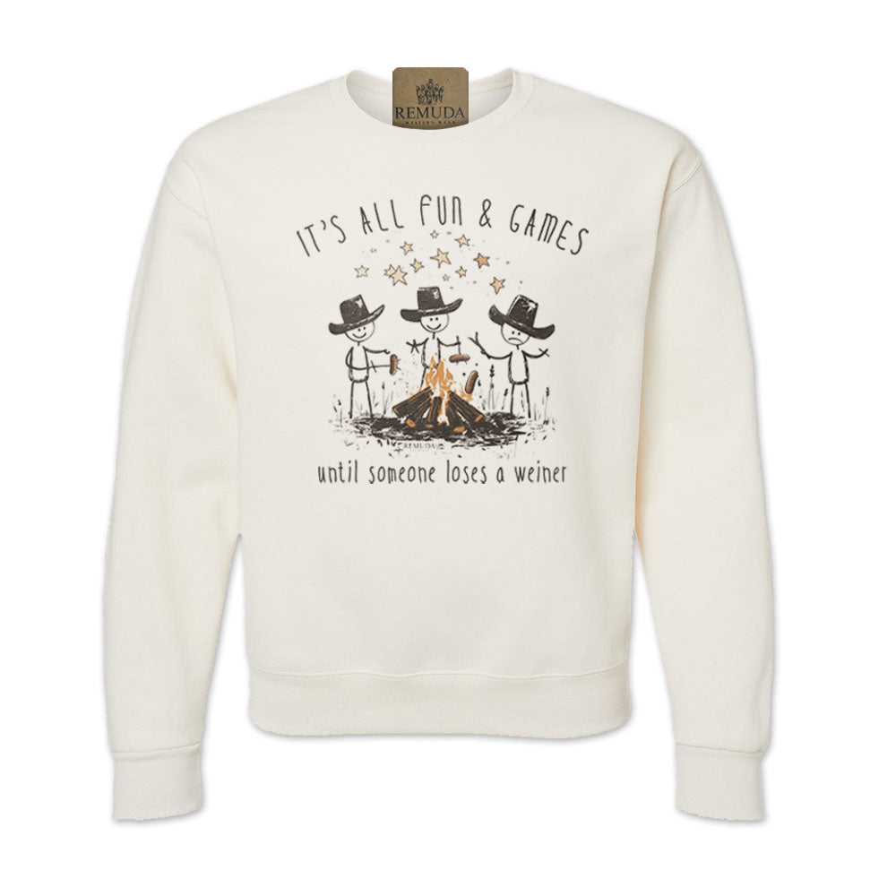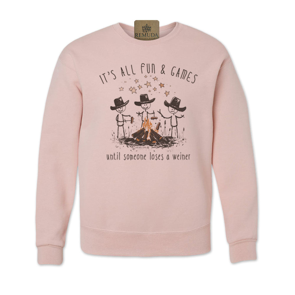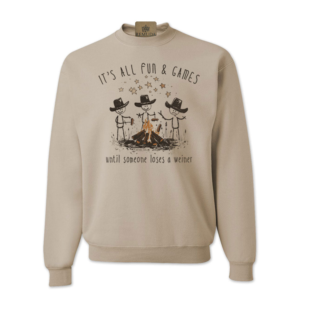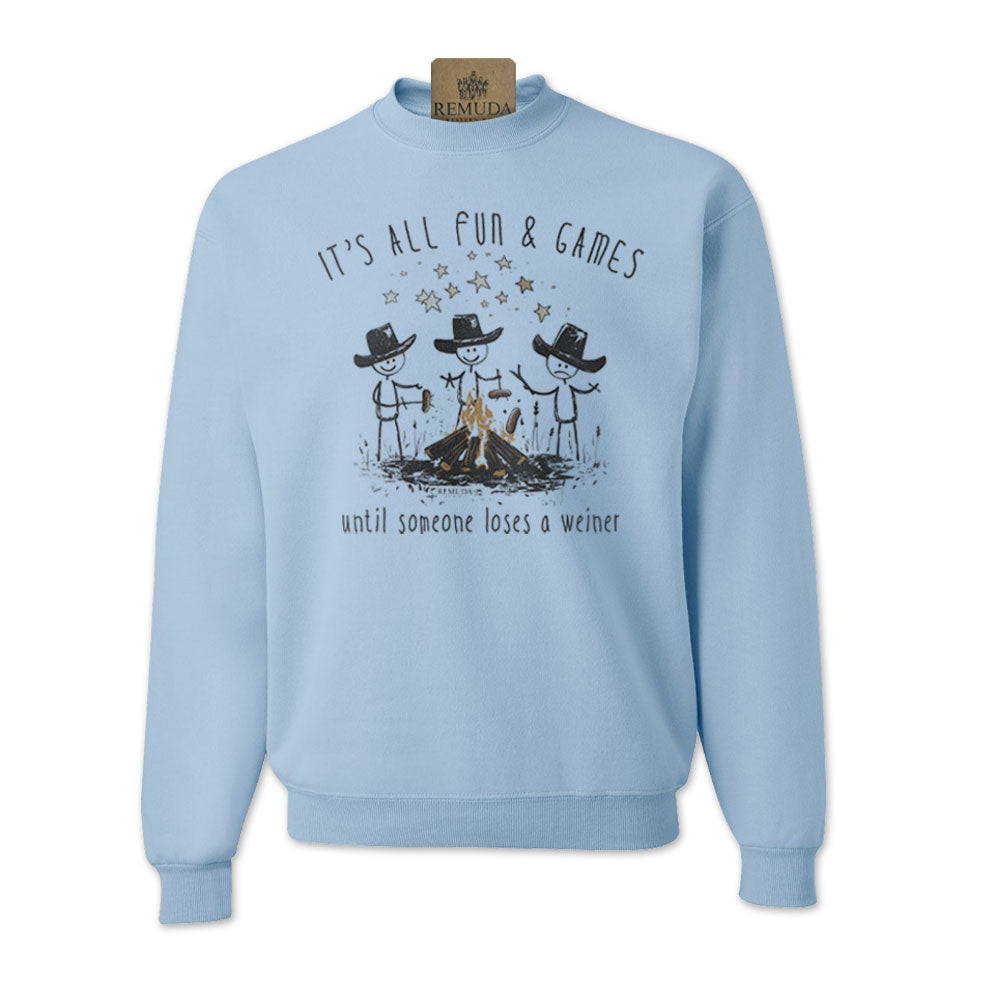 “It’s All Fun & Games Until Someone Loses A Weiner” - Whether you're wrangling cattle or just roasting hot dogs over a bonfire, this sweatshirt speaks the universal truth: chaos is always just a dropped weiner away. Perfect for camping trips, backyard barbecues, or that rowdy night around the fire pit, this sweatshirt will have everyone cracking up (and keeping a closer eye on their dinner). With a laid-back western vibe and a wink of humor, it’s the must-have gear for anyone who knows that sometimes grilling ain't for the faint of heart.