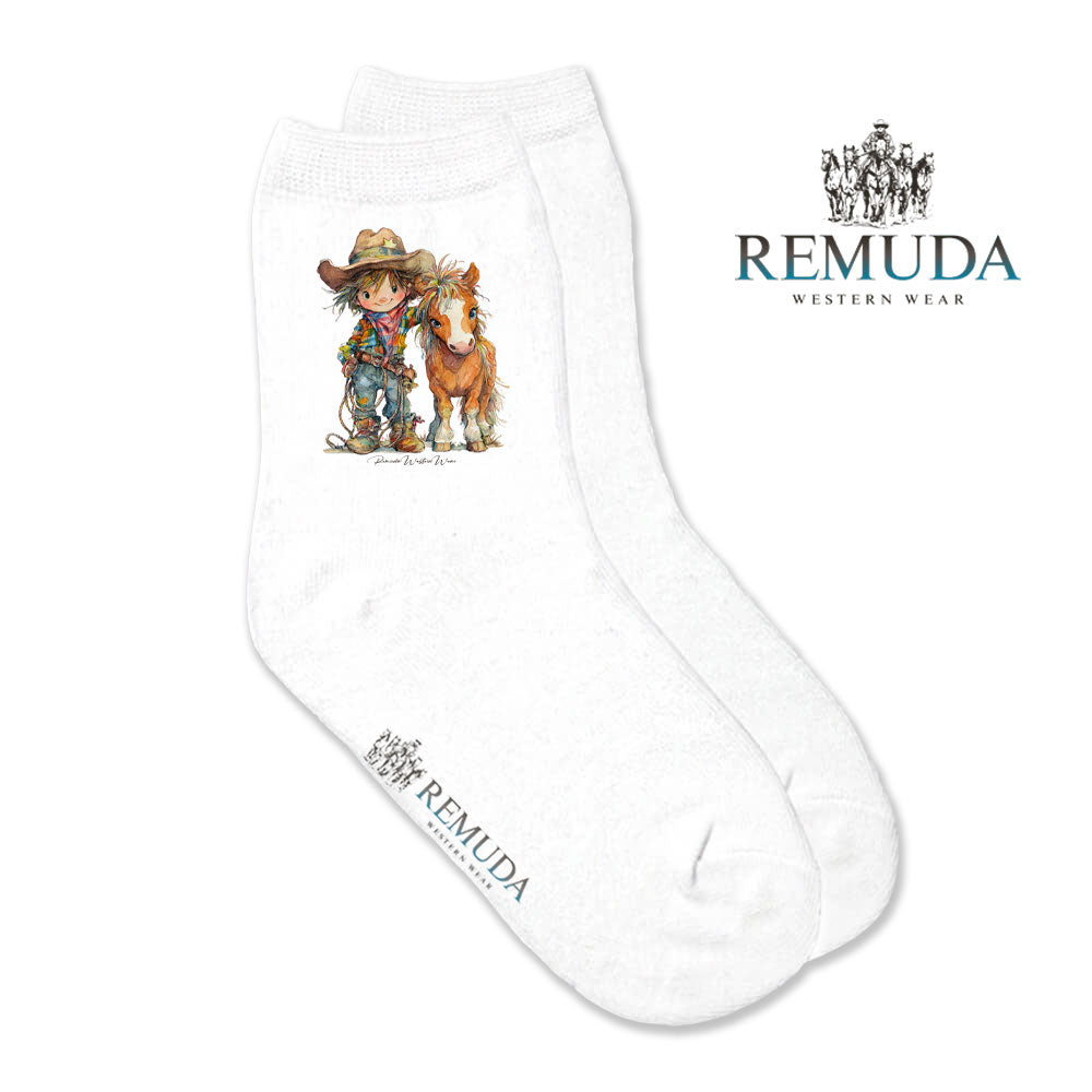 Straight from our Pony Pals Collection, these western crew socks feature a bright and cheerful little cowboy and his trusty pony pal - ready to hit the trail (or the playground) in style. Designed for infants to growing kids, they bring a splash of fun to every step.