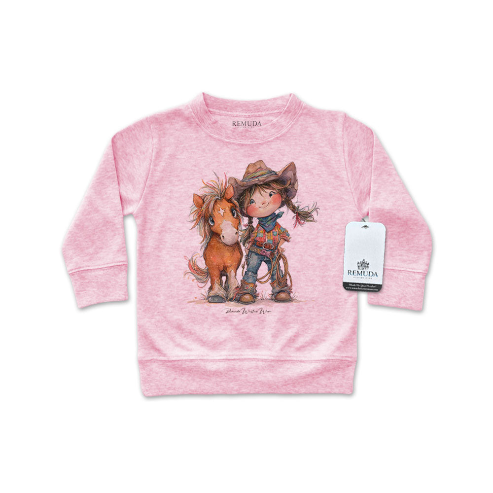 Straight from our Pony Pals Collection, this charming infant long sleeve pullover shirt features a cheerful little cowgirl and her trusty pony pal - ready to wrangle giggles, naps, and everything in between. With its soft fabric and playful western vibe, this pullover is made for everyday adventures on or off the ranch.